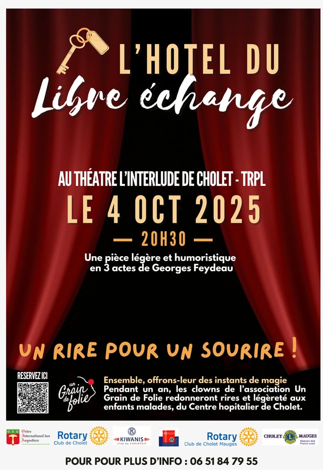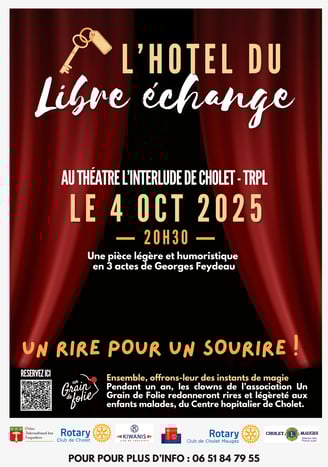 Le 4 octobre 2025 à 20h30, les six clubs choletais s’unissent pour organiser une représentation exceptionnelle de la comédie "L’Hôtel du Libre Échange" de Georges Feydeau, au Théâtre de l’Interlude de Cholet.